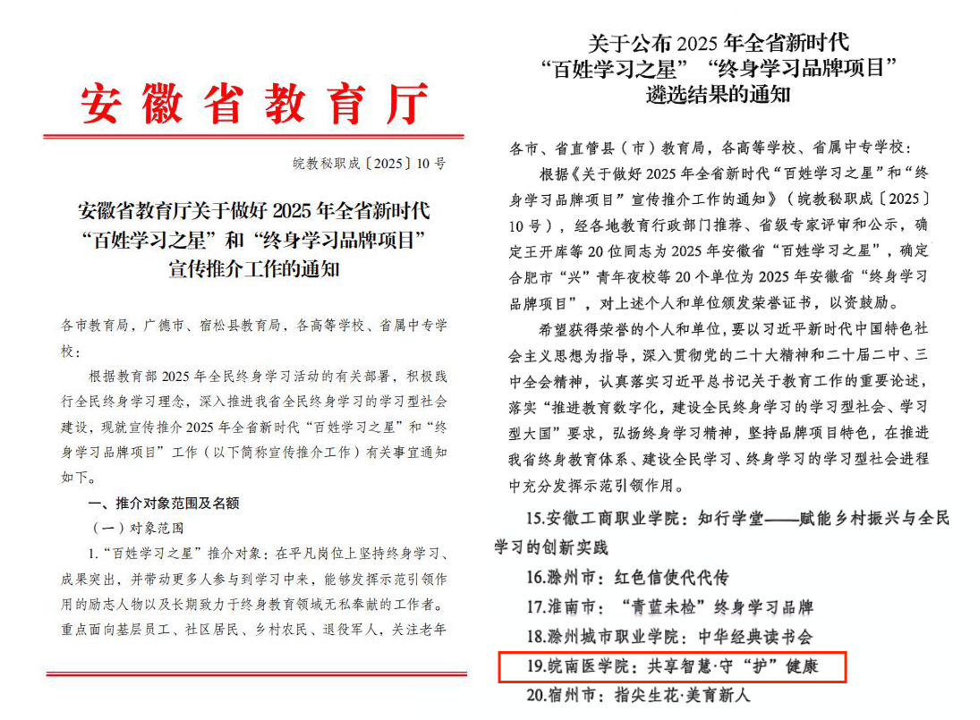 我校继2022年首次获安徽省“终身学习品牌项目”以来,今年再次获此殊荣,标志着我校在推进教育数字化、全民终身学习教育方面又迈出了坚实步伐。学校将以习近平新时代中国特色社会主义思想为指导,持续弘扬终身学习理念,优化健康知识普及体系,为安徽终身教育高质量发展贡献力量,为健康中国建设贡献智慧。(李钰/文、图)