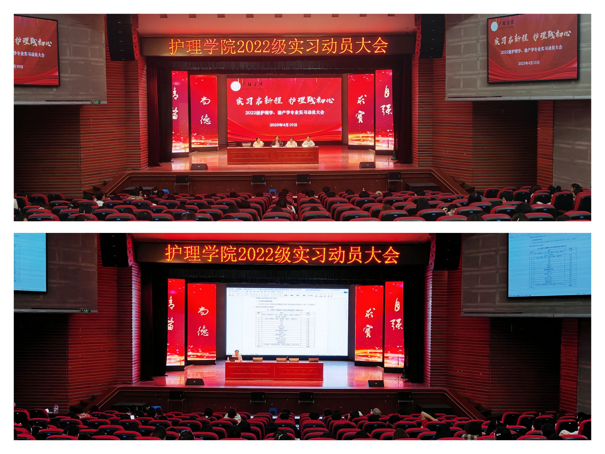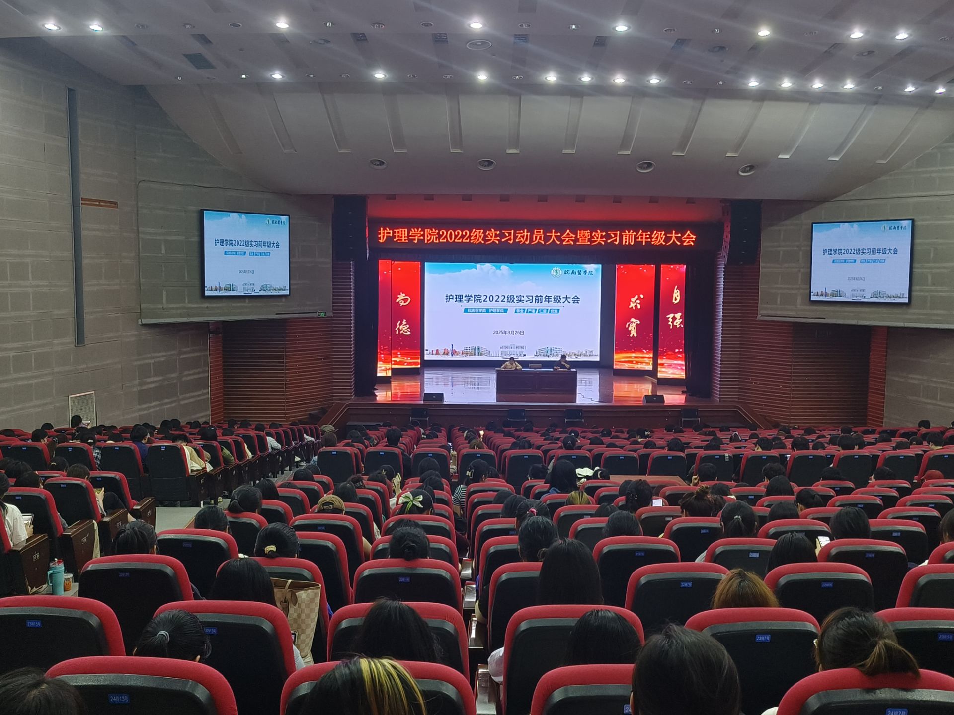 为扎实做好护理学2022级学生实习工作,4月11日,护理学院在滨江校区大学生活动中心大礼堂召开实习动员大会,护理学院院长李远珍、副院长崔慧霞、年级辅导员及2022级全体学生参加会议。会上,李远珍强调了实践教学的重要性,围绕职业防护、安全教育、工作纪律等方面对同学们提出了具体要求,勉励大家珍惜学习机会,端正学习态度,遵守规章制度,在实习岗位上砥砺素质、提升能力,为学院和学校增光添彩。崔慧霞详细解读了实习大纲中的科室轮转要求、实习管理制度、实习请假制度等,希望同学们转换角色快速适应,端正态度踏实学习,坚守初心笃志前行,以扎实的临床技能和温暖的人文关怀,答好这份关乎生命的青春考卷。年级辅导员强调了实习安全注意事项,提醒同学们尽快适应新环境,遵守实习单位规章制度,提前做好职业规划,树立正确的择业观和就业观,以饱满的精神状态投入新的学习阶段。