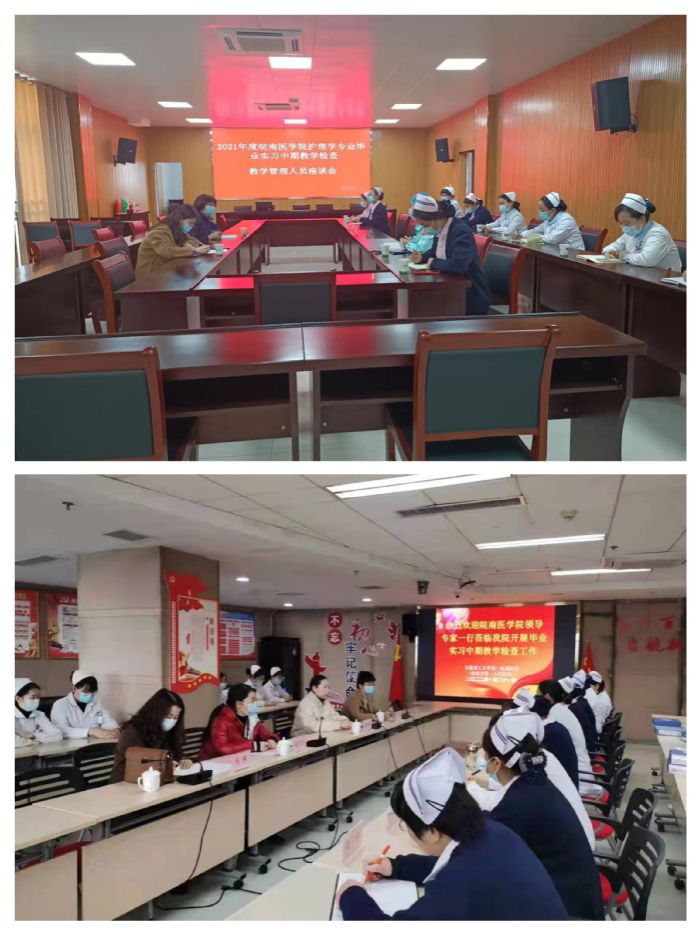 检查工作组每到一家实习医院,分别与实习医院分管领导、护理部负责人进行交流,深入科室实地考察带教情况、护理教学查房及实习学生技能操作等,同时召开实习带教教师座谈会和实习生座谈会,了解实习学生表现,征求对于实践教学工作的意见和建议,帮助同学们解决实习中存在的问题和困难。各实习医院充分肯定了实习生的学习态度和综合素质,实习学生纷纷表示,珍惜实习机会,坚守实习岗位,遵守实习纪律,圆满完成实习各项任务。