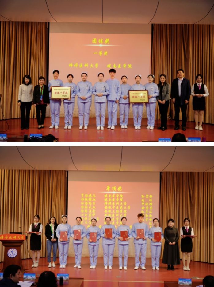 2024年3月30日,由安徽省护理学会护理教育专业委员会主办、蚌埠医科大学承办的以“医教协同,技能赋能,创新发展”为主题的安徽省第二届护理院校本科学生临床技能竞赛在蚌埠市举办。经过激烈角逐,我校代表队一举夺得团体一等奖,并获“胃肠减压”“静脉输血”“更换造口袋”“肌肉注射”护理操作4个单项奖。