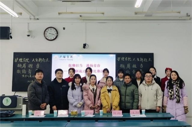 新时代造就新青年,新青年肩负新使命。2023年12月18日下午,护理学院“一站式”学生社区举办“人生新起点”之 “挺膺担当、激扬青春”演讲比赛。药学院团委书记唐保露,护理学院团委书记孙园、团委副书记陈雨,2020级年级主任周浩然,2023级年级主任沈阳老师担任比赛评委。100余名新生同学现场观看比赛。