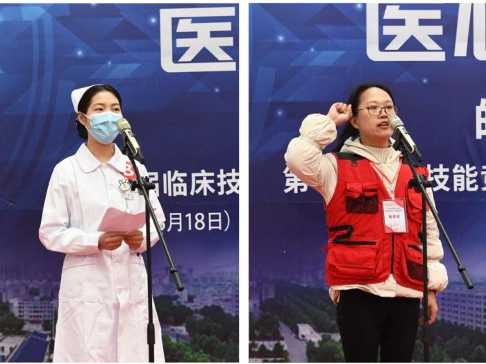 参赛选手代表、九游会ag318第一附属医院代表队左露娜同学,裁判员代表、基础护理学教研室张凤玲老师分别宣誓。