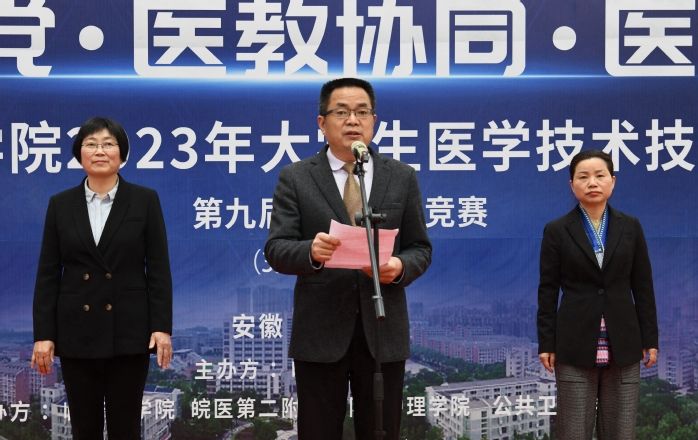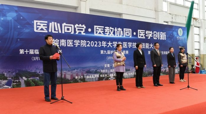 文育锋致开幕词,他首先向出席开幕式的参赛单位和嘉宾们表示热烈欢迎,向为本次比赛付出智慧和辛勤劳动的各位裁判员、工作人员和学生志愿者们表示衷心的感谢。他指出,临床实践能力是医学教育的重要内容,是护理学专业建设与改革的内在要求。大学生护理临床技能竞赛是护理学子悟医道、精医术、展风采的大舞台,不仅有助于提升学生的职业能力和实践动手能力,同时对于护理教育与行业需求紧密衔接起着积极的推动作用。他对举办好本届竞赛提出了希望和要求:一是精心组织、周密安排;二是公平公正、规范有序;三是切磋交流、共同提高。宝剑锋从磨砺出,梅花香自苦寒来。他祝愿各参赛队和各位参赛选手挑战自我、再创佳绩,赛出风采、赛出水平。