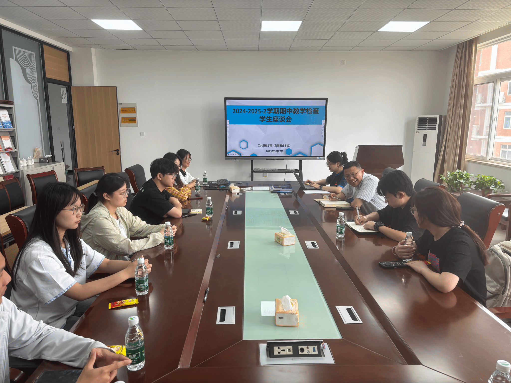 为落实学校 2025 年春季期中教学检查工作部署,公共基础学院于 5 月 26 日 及 27 日在学院会议室分别组织召开教师座谈会及学生座谈会。座谈会由学院院长汪全海主持,学院教学秘书、各教研室教师代表、各学院学生代表参加会议。