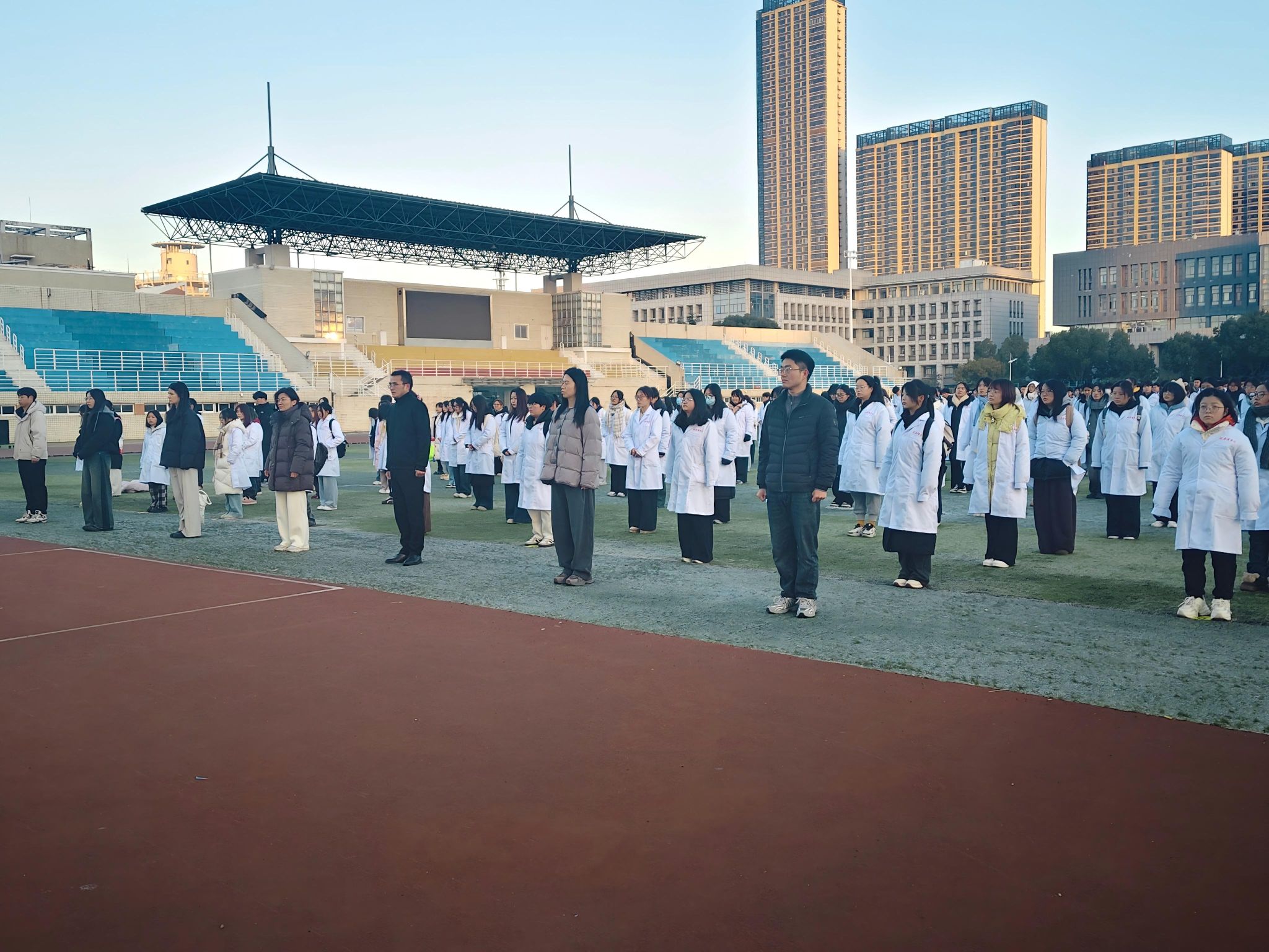 随后,四名新生代表深情朗诵《烽火八十载,诗魂照千秋》,带领师生重温历史,弘扬伟大抗战精神,凝聚奋进力量。朗诵毕,活动迎来高潮——全体新生身着白衣,高举右拳,庄严宣誓,表达了献身医学、服务人民的坚定决心。最后,全体师生齐声奏唱校歌,风中飘扬的国旗与嘹亮的歌声交融,传递出对学校的热爱与师生团结前行、共创未来的信念。