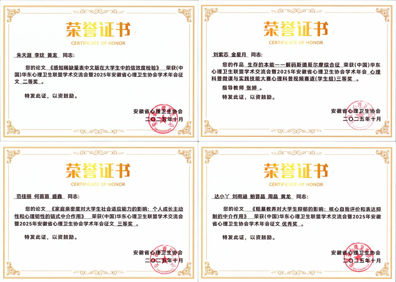 值得一提的是,在大会举办的学生论文征文和科普活动中,我校学生表现卓越,他们凭借扎实的学术功底、敏锐的创新思维和严谨的科研态度,在众多参赛者中脱颖而出,斩获二等奖1项、三等奖2项、优秀奖1项。这一优异成绩不仅是对我校学生个人能力的肯定,更是我校心理学教育成果的生动体现,充分展现了我校学生扎实的学术功底与出色的创新能力。