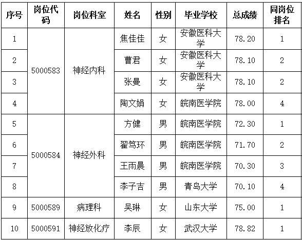 按照工作要求,首都医科大学附属北京天坛医院安徽医院开展了2025年编内硕士公开招聘工作。经信息发布、网上报名、资格审查、现场确认、笔试、技能考核、面试、体检、考察、医院研究、医院公示、学校研究等环节,焦佳佳等10名考生进入拟录用人员名单。现将考生情况进行公示(见附表)。如有异议,请书面向校纪委办、人事处、第二附属医院纪委办反映。