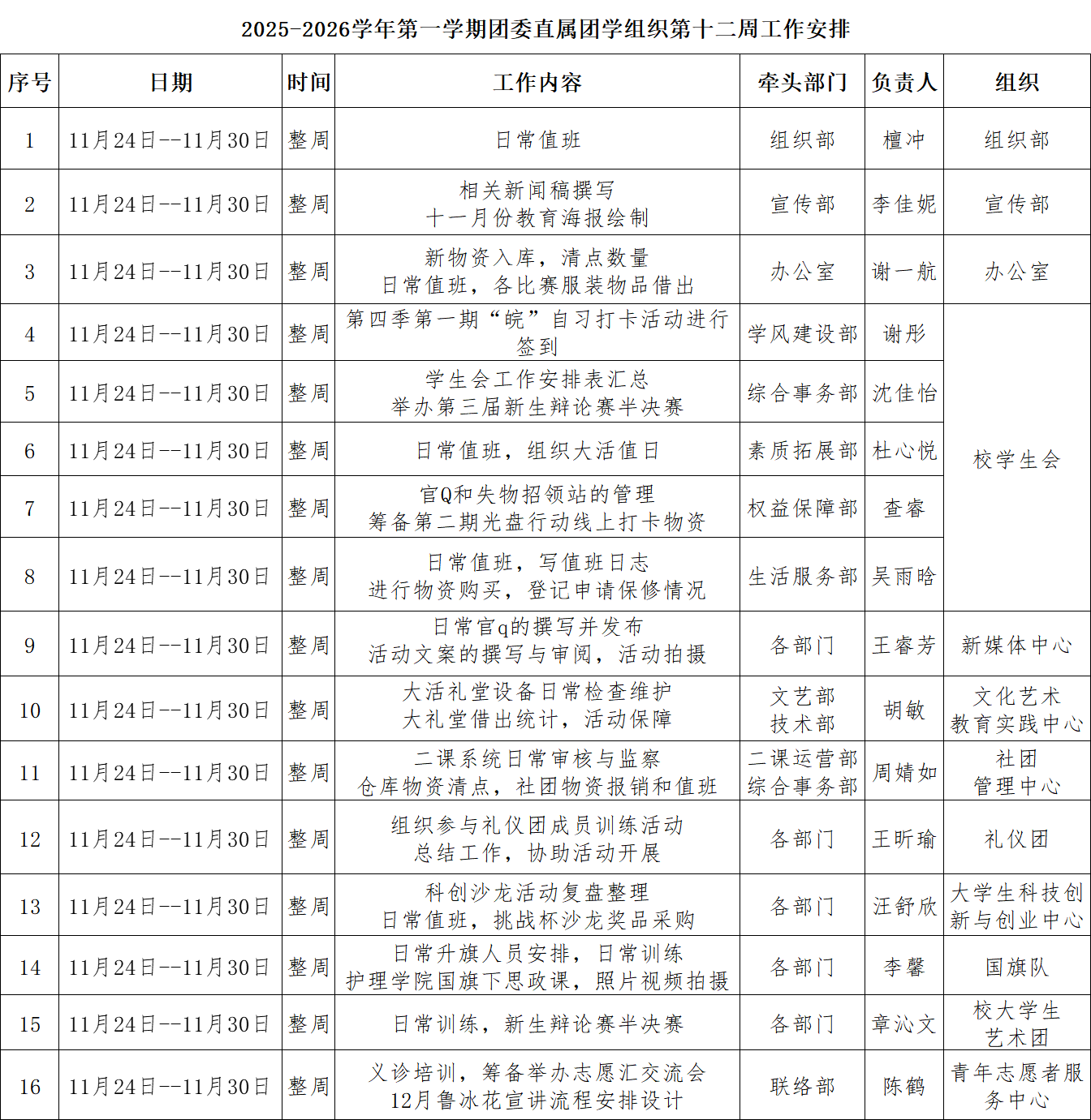 2025-2026学年第一学期团委直属团学组织第十二周工作安排