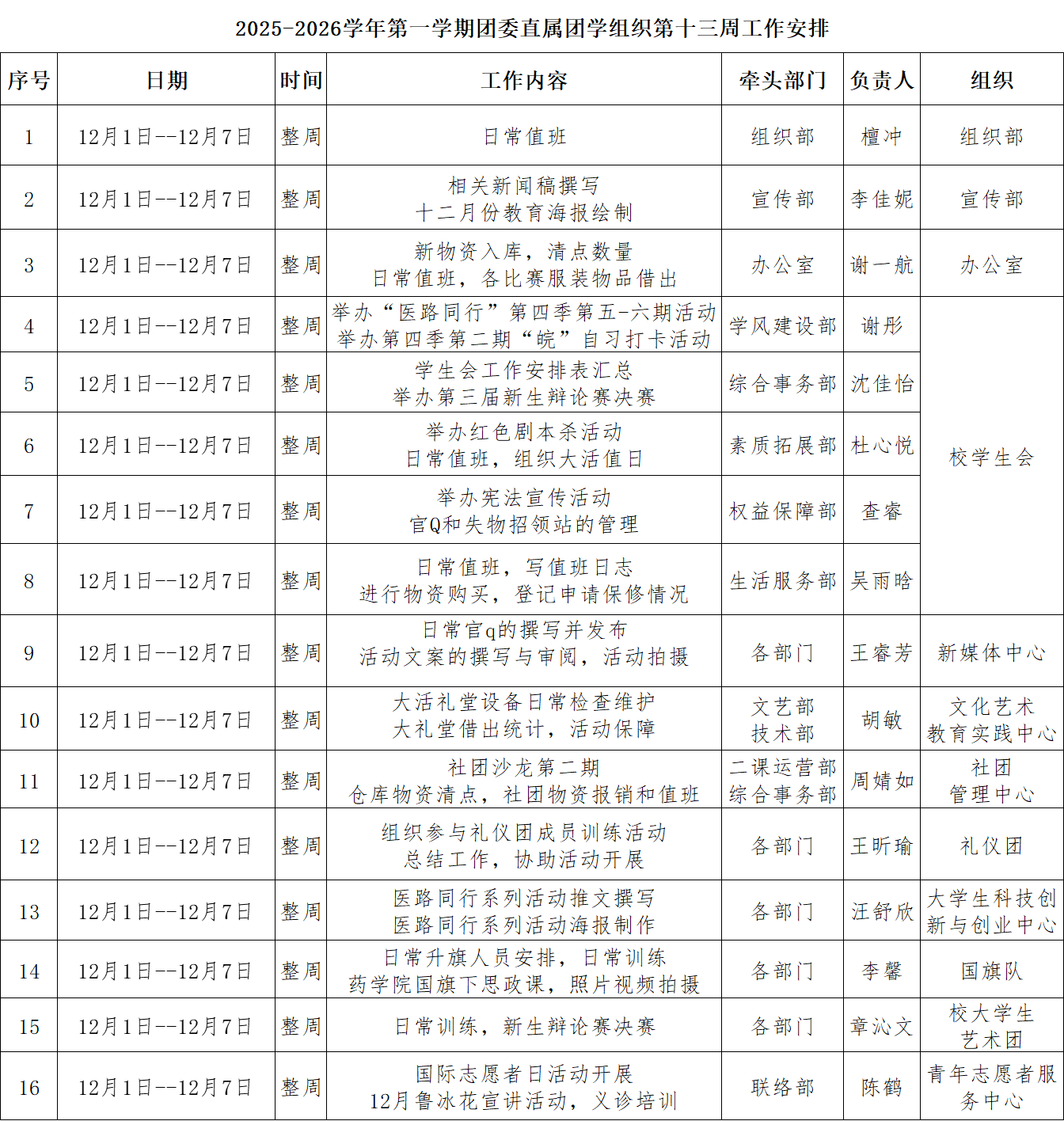 2025-2026学年第一学期团委直属团学组织第十三周工作安排