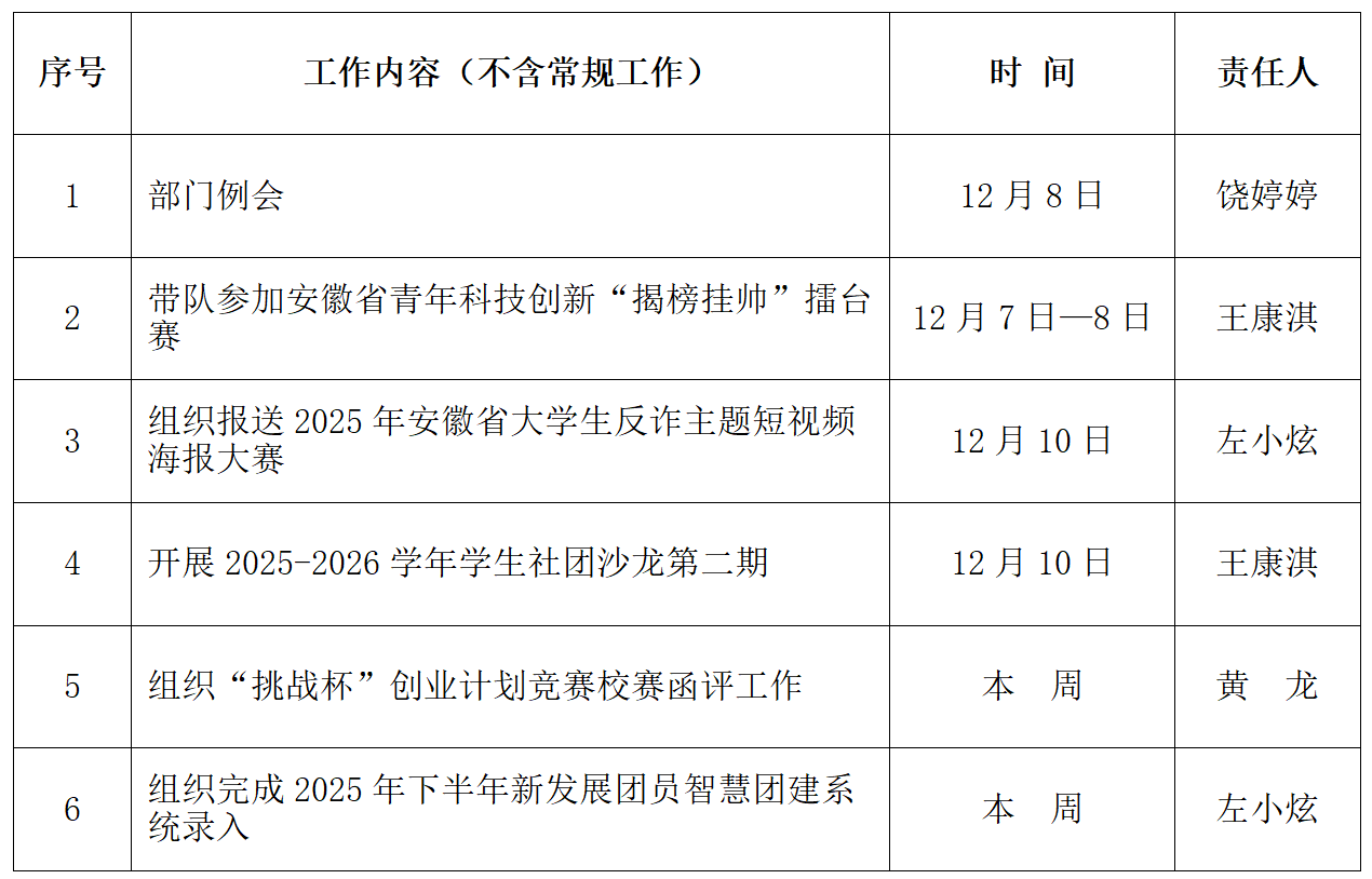 校团委2025-2026学年第一学期第十四周主要工作安排表