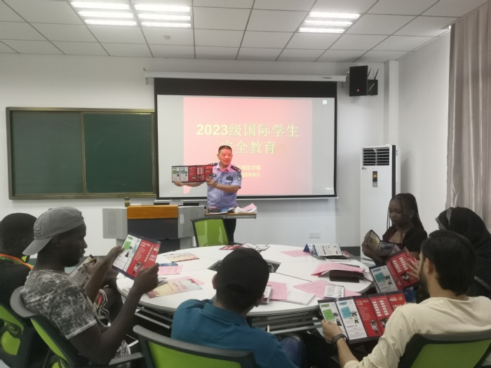 为树牢国际学生遵纪守法和自我保护意识,国合处特邀辖区派出所民警周英坤就涉外法律法规、来华留学生管理条例、防范电信诈骗等问题开展宣传教育。凭借多年的一线工作经验,周警官利用真实案例深入浅出地强调了在华学习证件办理、警惕电信网络诈骗、道路交通及用电安全等内容,为新生上了一堂生动又深刻的安全教育课。