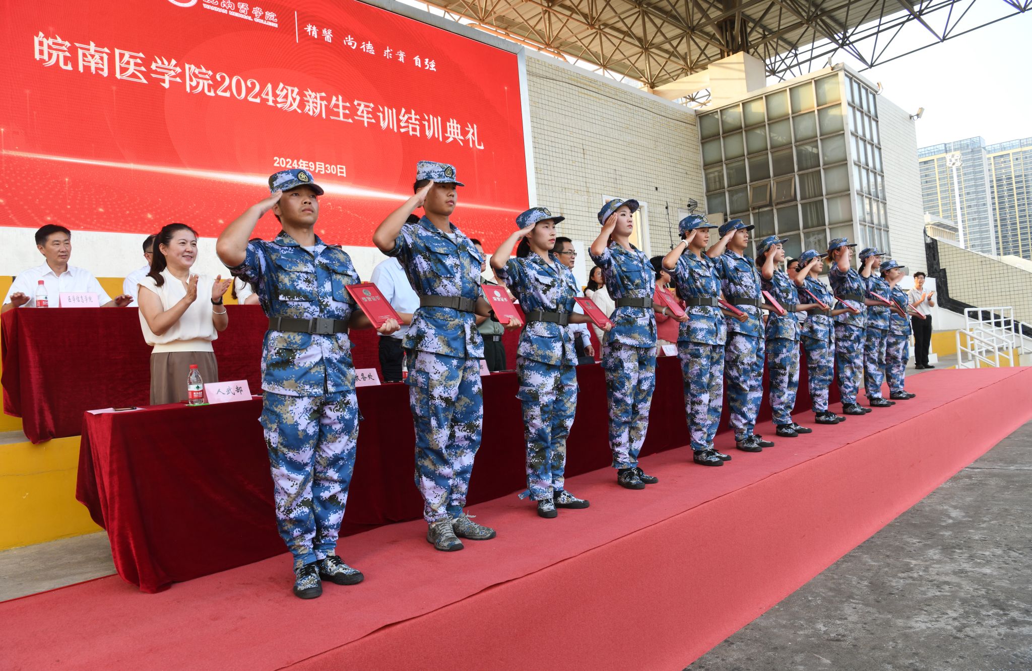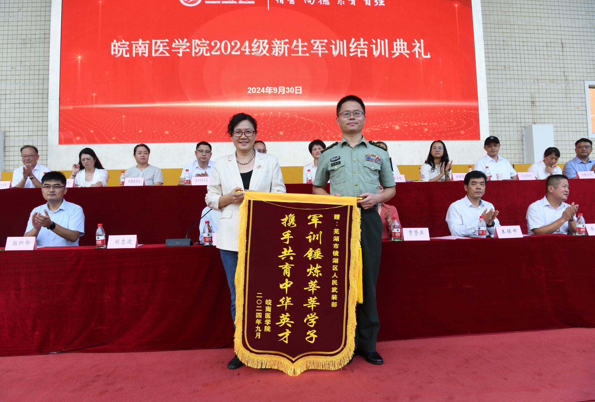 青春向党行,沙场秋点兵。9月30日下午,伴随着庄严的升旗仪式,我校2024级新生军训结训典礼在滨江校区(北区)田径场隆重举行。校党委书记夏劲松,党委副书记贾贤燕,副院长文育锋,纪委书记、监察专员王保中,芜湖市镜湖区人武部部长刘忠波出席典礼活动。大会由文育锋主持。