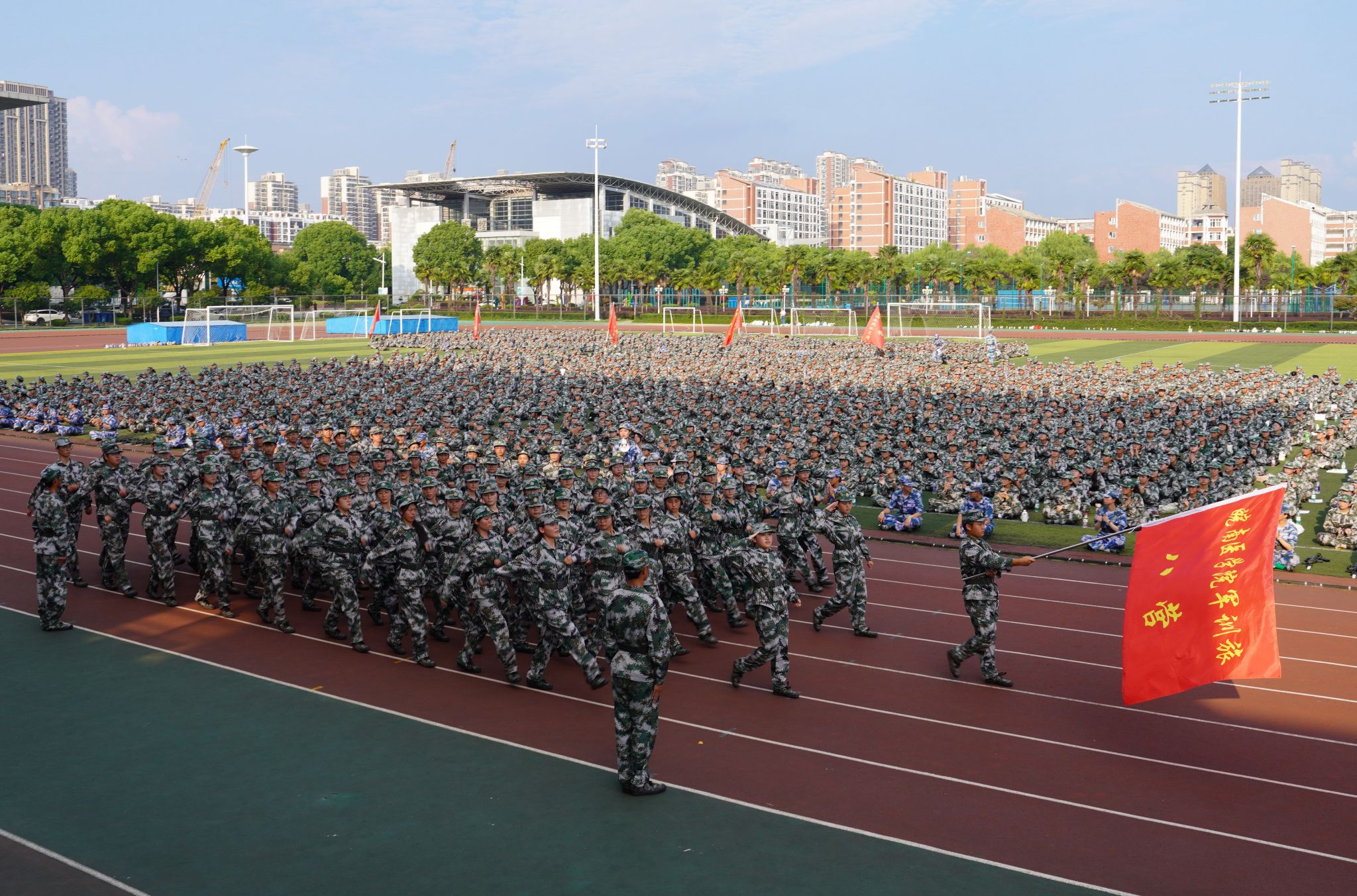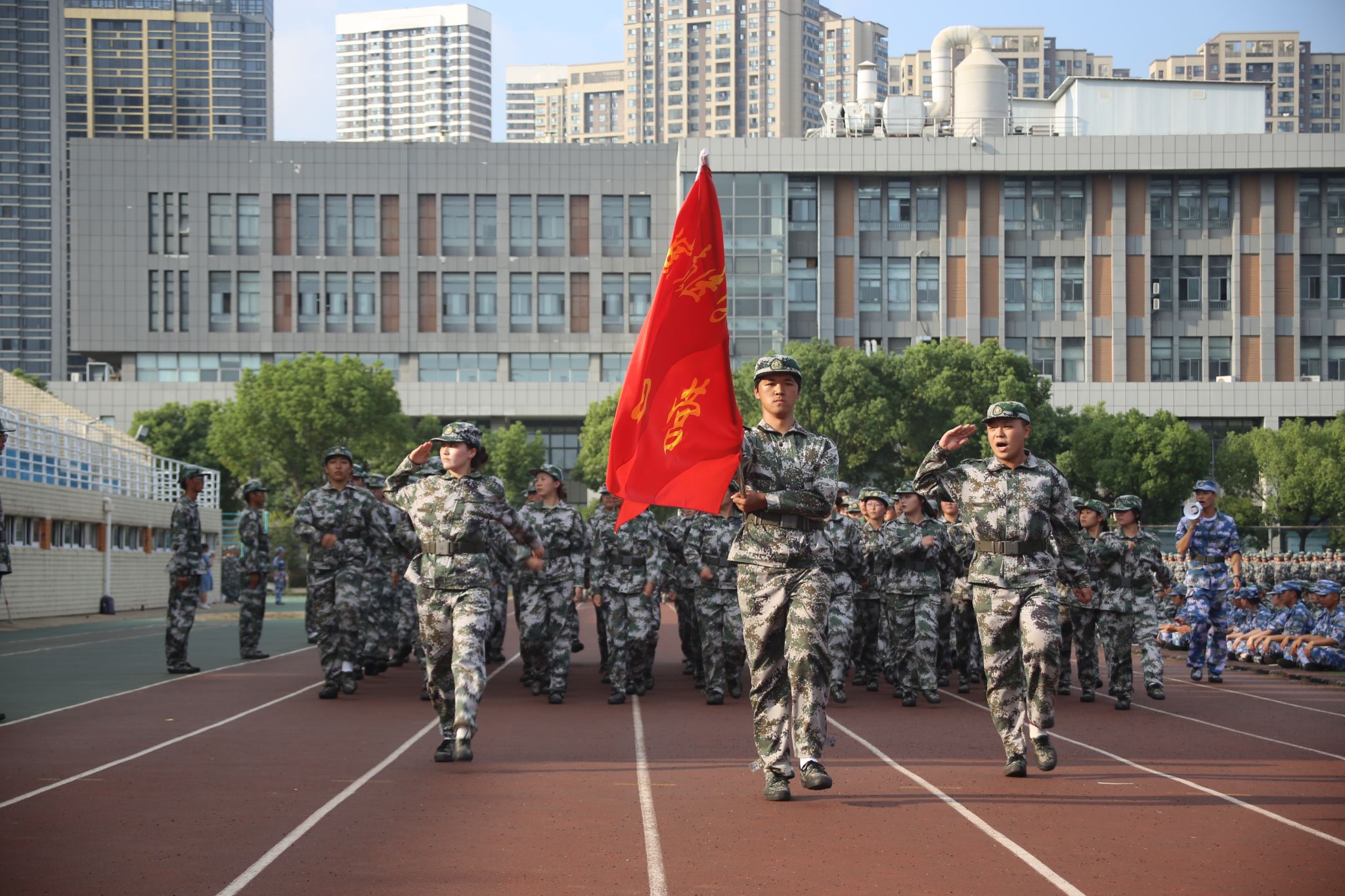 学校相关职能部门及各学院负责人,军训教官,各学院新生辅导员和全体参训新生参加大会。(骆成/文 侯东晓、何丽、王琛/摄)