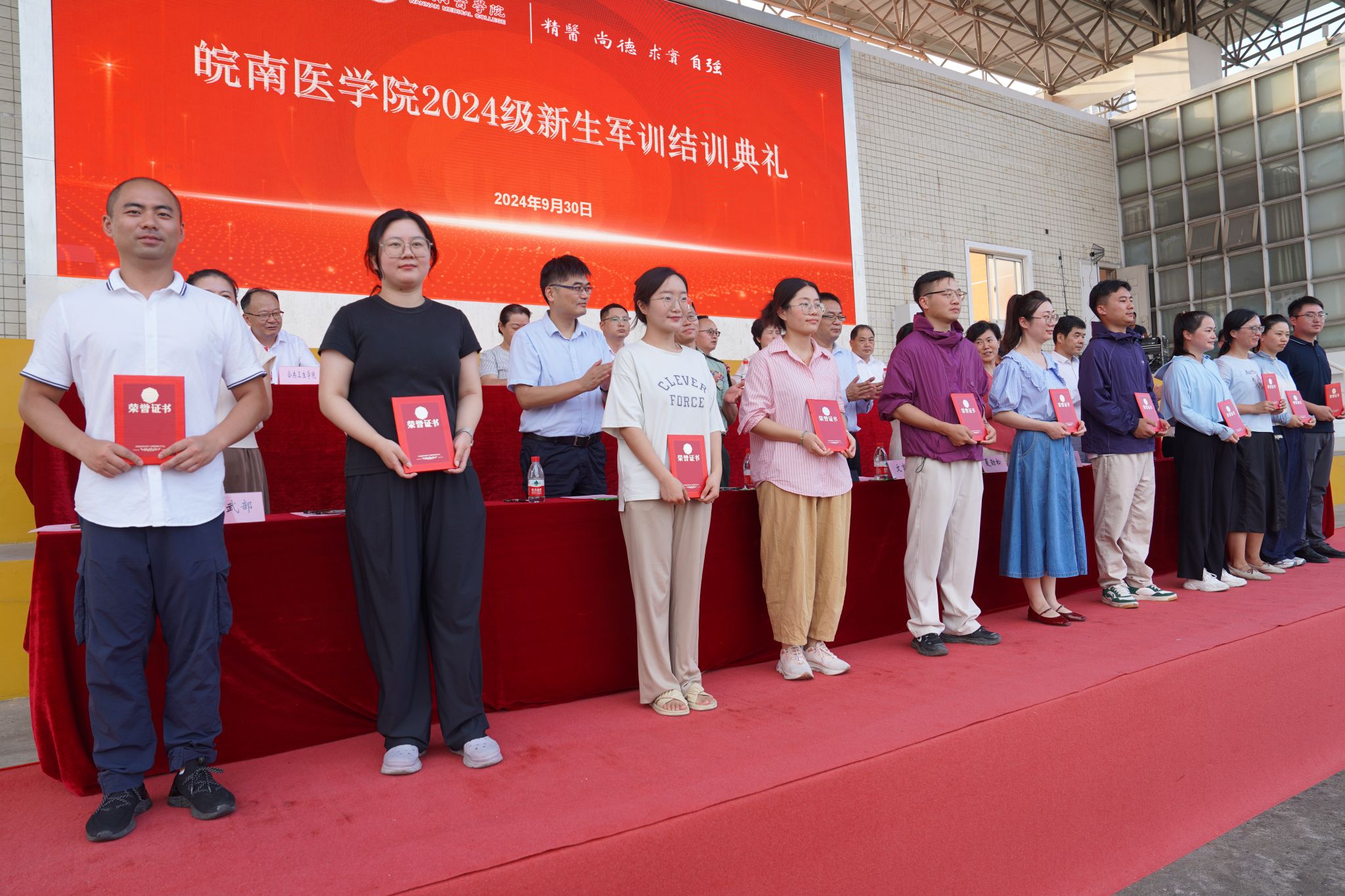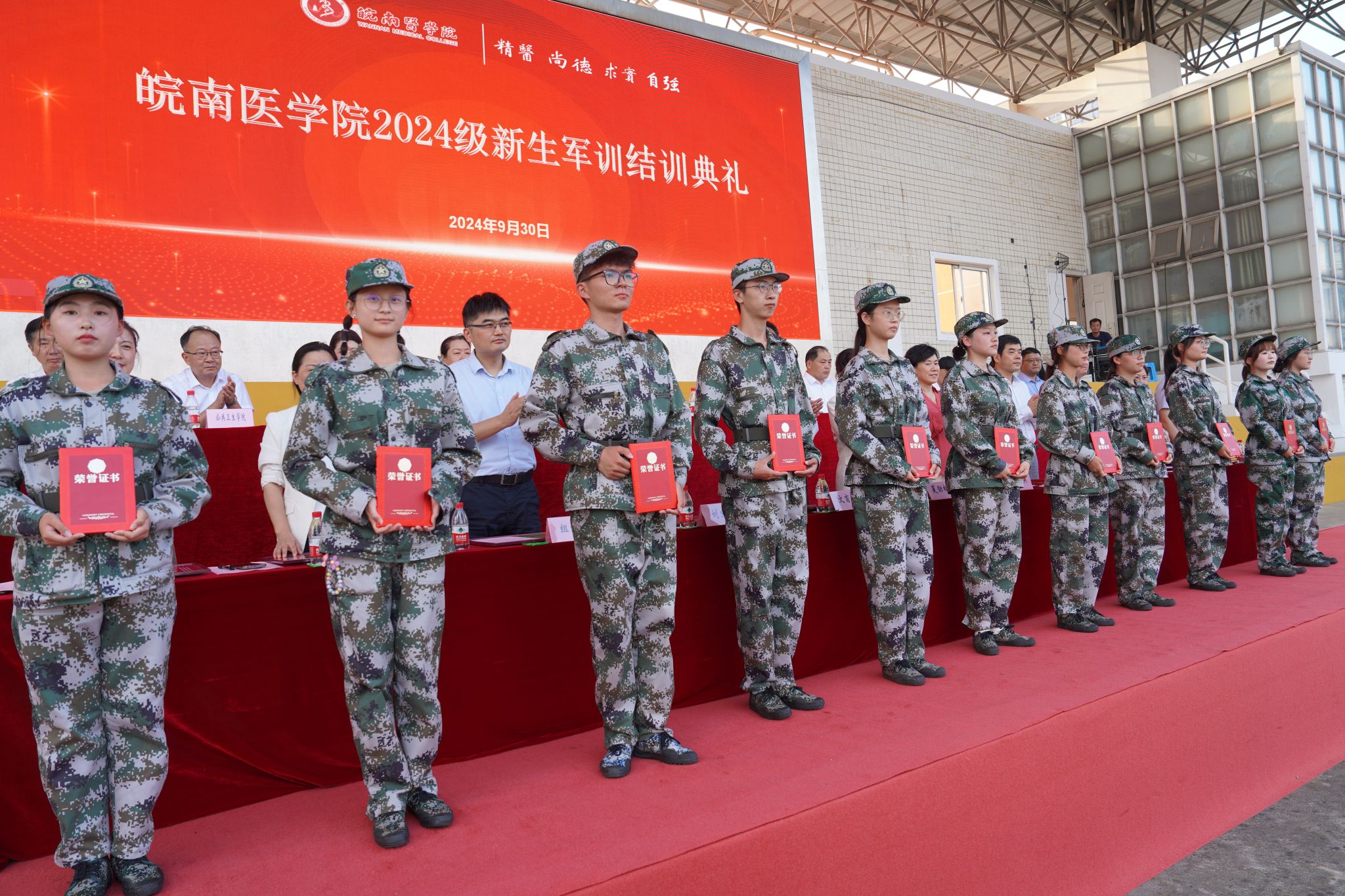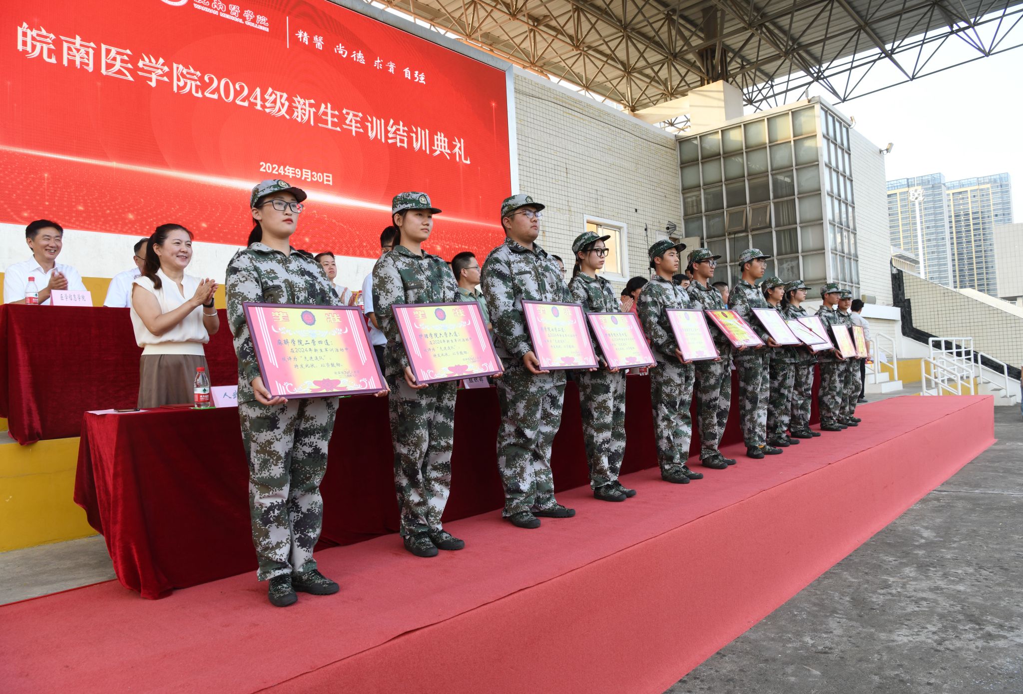 王保中宣读《关于表彰2024年军训工作先进连队和先进个人的决定》。学校领导分别为优秀学员、先进连队、优秀教官和优秀指导员颁发获奖证书。