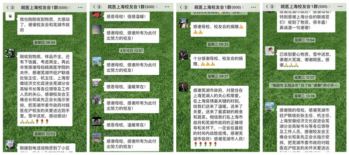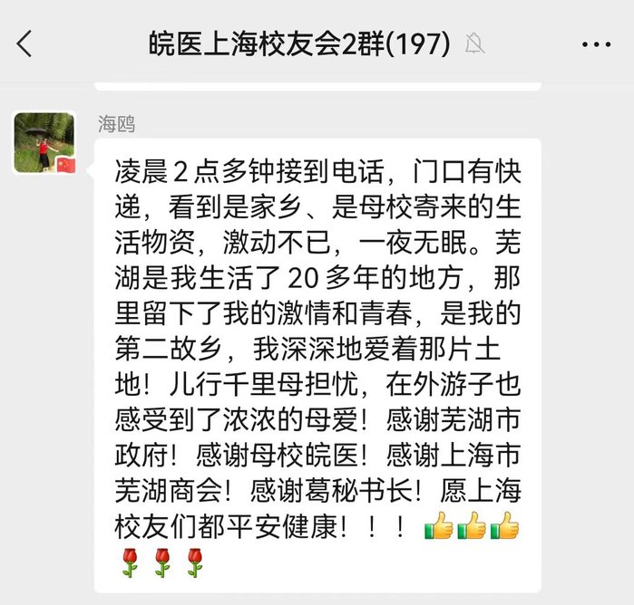 雪中送炭的物资包让校友们百感交集、感动不已,新鲜的蔬菜、“下饭酱”、火腿肠……这在平时再普通不过的物资,此刻却是那么贵重,尤其大米包装上赫然四个字“芜湖大米”更是让校友瞬间破防,热泪盈眶。坚持在抗疫一线的2015届校友汪守丽激动地说:“毕业这么多年了,母校还能记得我们,心里真的是非常的激动与感动,希望疫情能早日结束,能回到母校去看一看原来的老师!”1989届校友袁金玉感慨道:“凌晨2点多接到电话,看到是家乡、是母校寄来的生活物资,激动不已,一夜无眠!” 2012届校友牛小引留言道:“看到‘芜湖大米’四个字都快泪崩了,感谢芜湖市政府,感谢芜湖市政府驻沪办事处,感谢皖医校友会!”校友群里排队致谢,“感谢母校”四个字更是刷爆朋友圈。