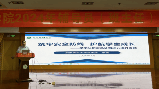 安徽医科大学学工部部长、安徽省高等学校科学研究项目、安徽省教育厅“三全育人”项目主持人秦楠,作题为“筑牢安全防线,护航学生成长——学工队伍应急处置能力提升”讲座,重点关注高校安全风险重点领域,加强理论学习、形势研判、信息搜集、预案应对、经验积累、自我调节,全面提升学工队伍应急处置能力。