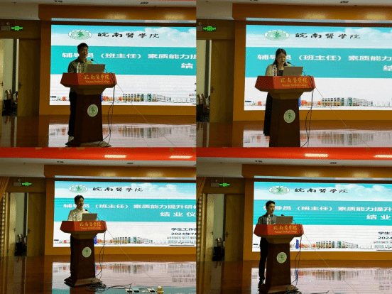 结业仪式上,学员代表公共卫生学院辅导员华龙、麻醉学院辅导员杨伟琼、护理学员辅导员周浩然、口腔医学院辅导员余其柱分别发言,回顾两天的研修学习既有辅导员在工作中所需要的谈心谈话、危机处理等“脚踏实地版”的技能培训,也有育人实践和理论创新等“仰望星空版”的知识学习,更有身边的榜样皖医优秀辅导员“文武双祥”的经验分享,为辅导员提供了一个“他山之石可以攻玉”的交流平台,学员们共同经历了知识的洗礼、思维的碰撞和情感的交融,感到受益匪浅,收获颇丰。
