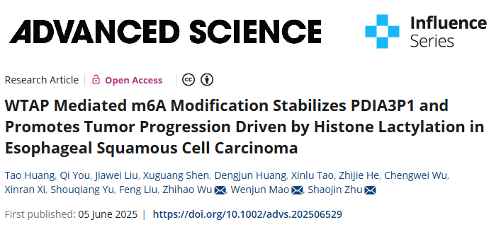 近日,我校2022级外科学研究生黄滔在《Advanced Science》(中科院一区 TOP,IF = 14.3)在线发表了题为《WTAP Mediated m6A Modification Stabilizes PDIA3P1 and Promotes Tumor Progression Driven by Histone Lactylation in Esophageal Squamous Cell Carcinoma》的研究论文。