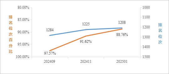 2025年1月最新数据统计,在ESI所有学科综合排名中,全球共有9717家机构进入前1%,我校位列全球3790名,排名较11月提升33名,较去年同期(2024年1月)提升303名;位次百分比为39.00%,较11月提升1.10%,较去年同期提升6.20%。