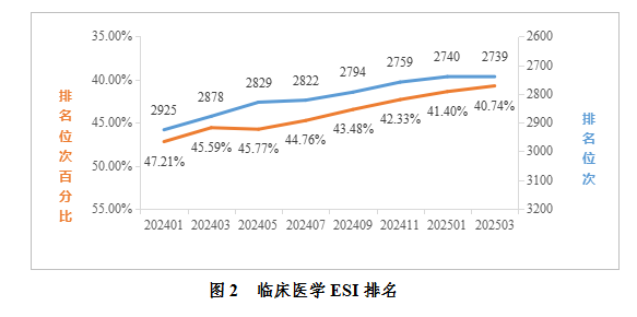 临床医学:据2025年3月数据统计,我校临床医学进入ESI前1%。全球共6723家进入全球前1%,我校位于全球第2739名,排名较1月上升1位,较去年同期提升139位;位次百分比为40.74%,较1月份提升0.66%,较去年同期提升4.85%。