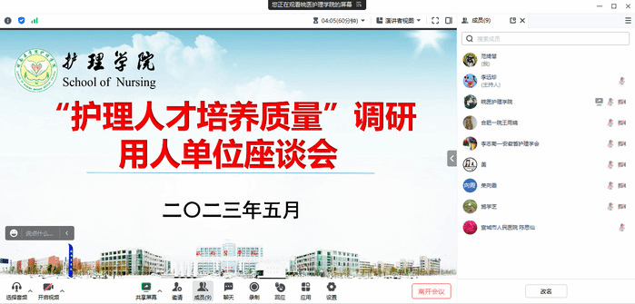 为进一步构建新型护理人才培养体系,保证培养方案修订科学性与实践性,5月31日,护理学院召开以“护理人才培养质量”为主题的用人单位调研座谈会,12家用人单位应邀线上参会,学院党政领导和师生代表参加会议。学院院长李远珍主持座谈会。